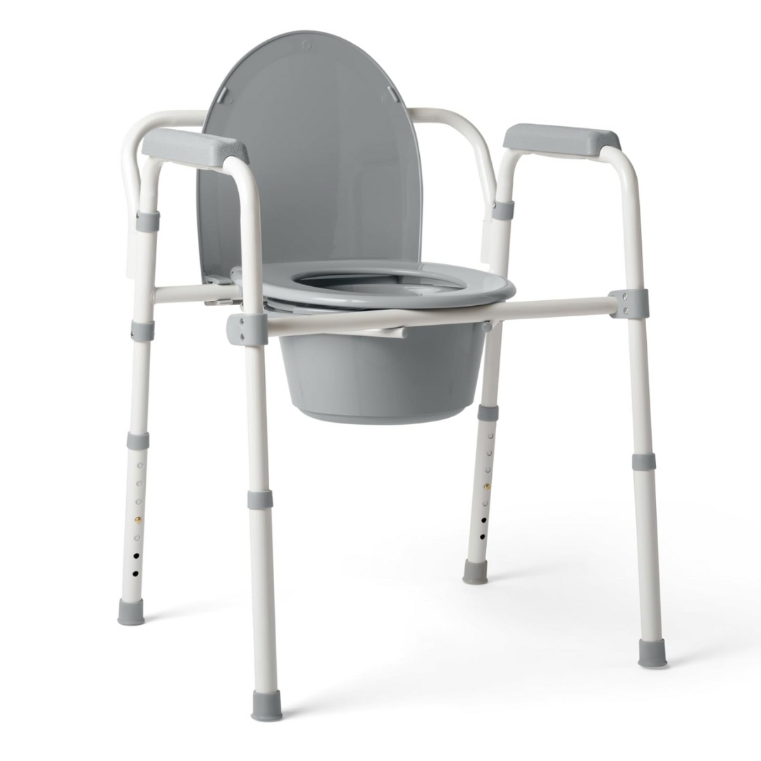 The Medline 3-in-1 Steel Bedside Commode, Standard Seat is a versatile and durable toileting aid designed to enhance safety and convenience for individuals with mobility challenges. Its 3-in-1 functionality allows it to be used as a standalone bedside commode, a raised toilet seat over an existing toilet, or as a toilet safety frame. Constructed with a sturdy, powder-coated steel frame, it supports up to 350 lbs and features a folding design for easy storage and transport. The commode includes a standard seat with lid, a 7.5-quart bucket with a carry handle and lid, and a splash guard for added hygiene. Tool-free assembly and adjustable seat height (16–22 inches) ensure user comfort and ease of use. |