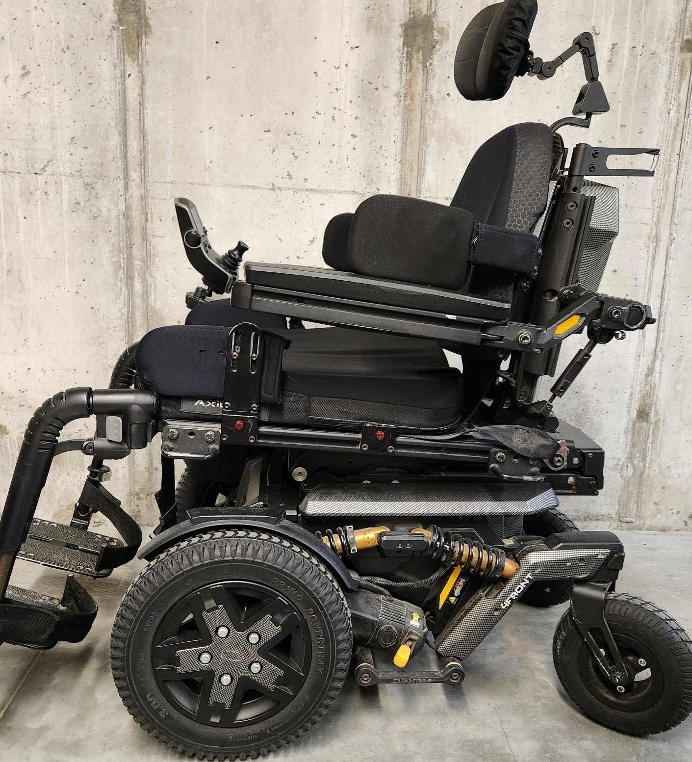 This is a custom-built Quantum 4 powered wheel chair. Comes with every available option. Head rest, arms, side cushions all fully adjustable and removable. The chair raises, lowers, tilts and reclines. Custom color, comes with additional cushions, wall charger. Chair includes Quantum 4 Front Power Base, Group 34 AGM Cell Interceptor Batteries, Flat Free Drive Tires and Casters, Q-logic Joystick Controller, Swing Away Joystick Bracket, Q-logic Power Motors, Q-Logic Control Module, Electronic Harnesses, Tru Balance Power Tilt and Recline Seating System, Seat Pan-Armrests Seating Assembly, Seat Belt, Power Seating Function Module, 10" Comfort Plus Headrest Pad with Mounting Bracket, Power Center Mount Articulating Foot Platform, Off Board Charging System. See link for additional.